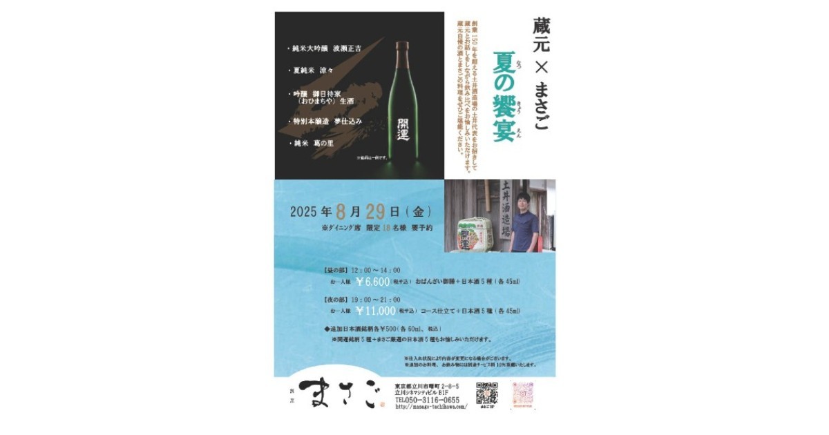創業150年を超える土井酒造場の土井代表をお招きして蔵元とお話をしながら飲み比べをお愉しみいただけます。蔵元自慢の酒とまさごの料理をぜひご堪能ください。