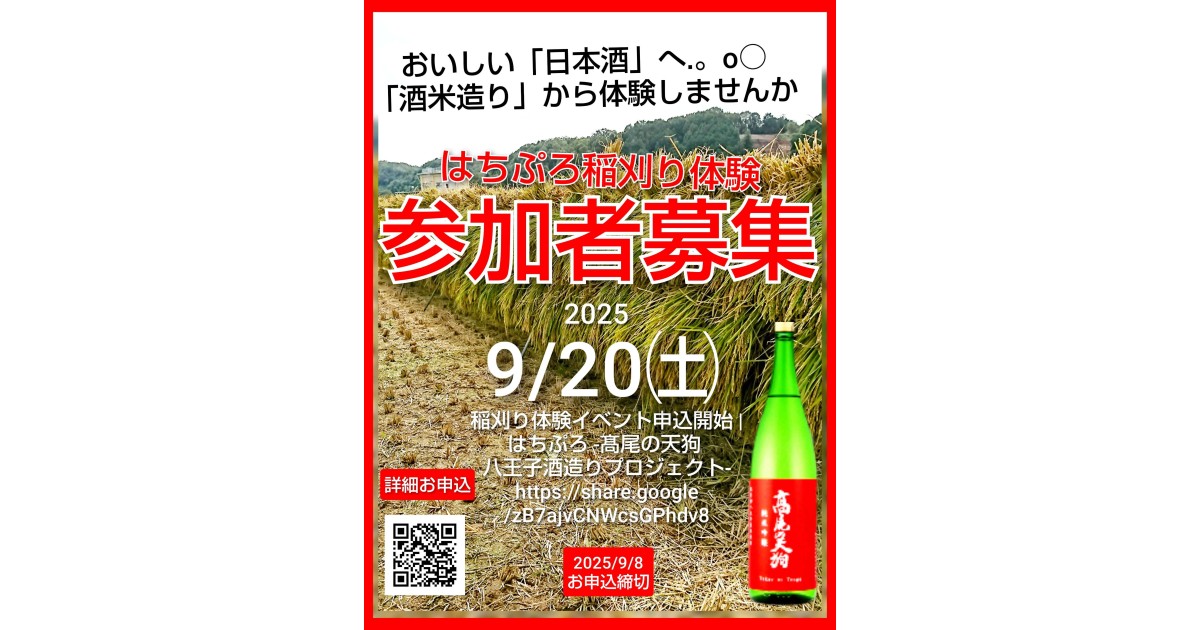 - 稲刈り体験イベント申込開始 | はちぷろ -髙尾の天狗 八王子酒造りプロジェクト- https://share.google/L9ZXCVGjHlsvMXhEe